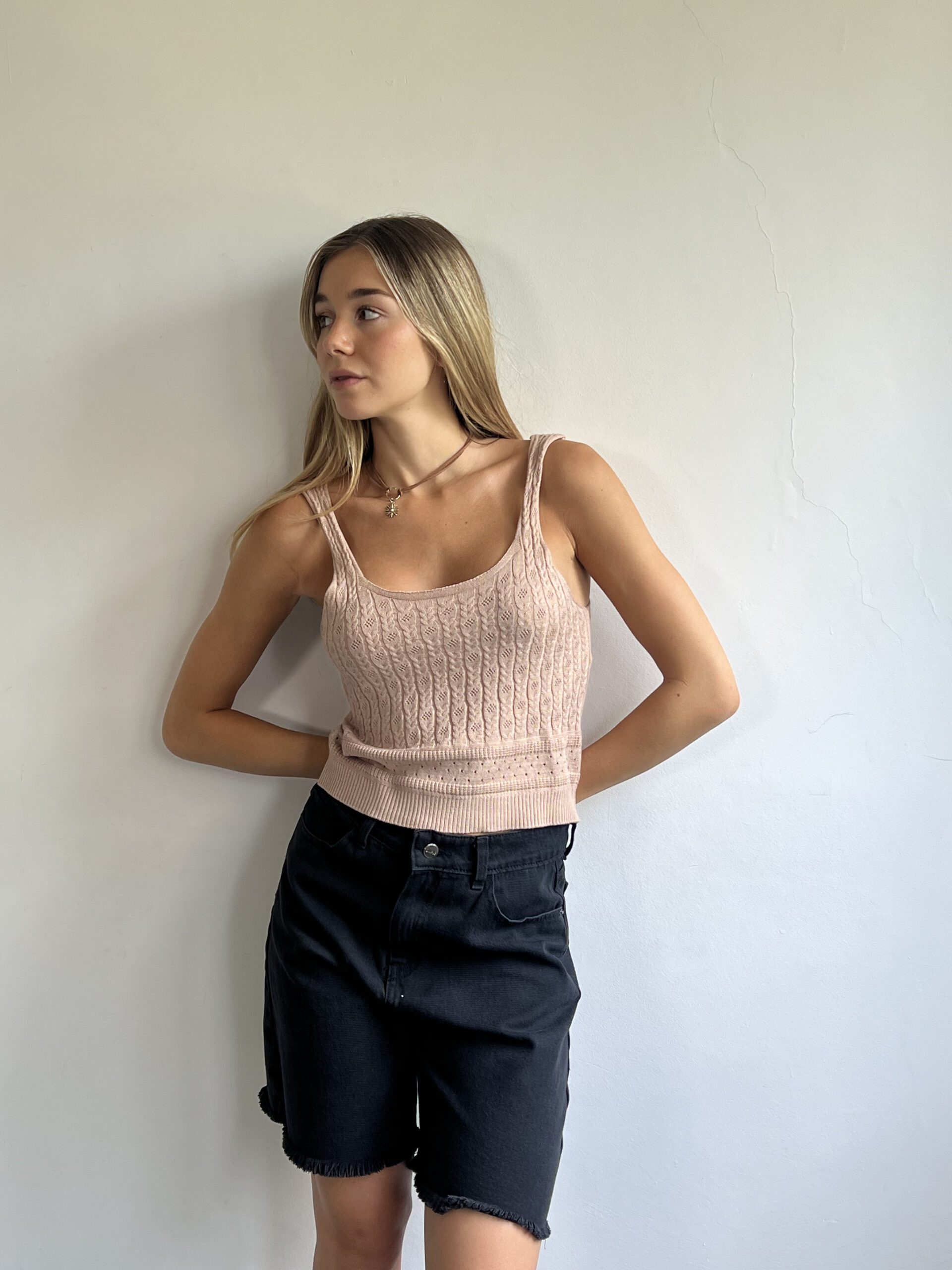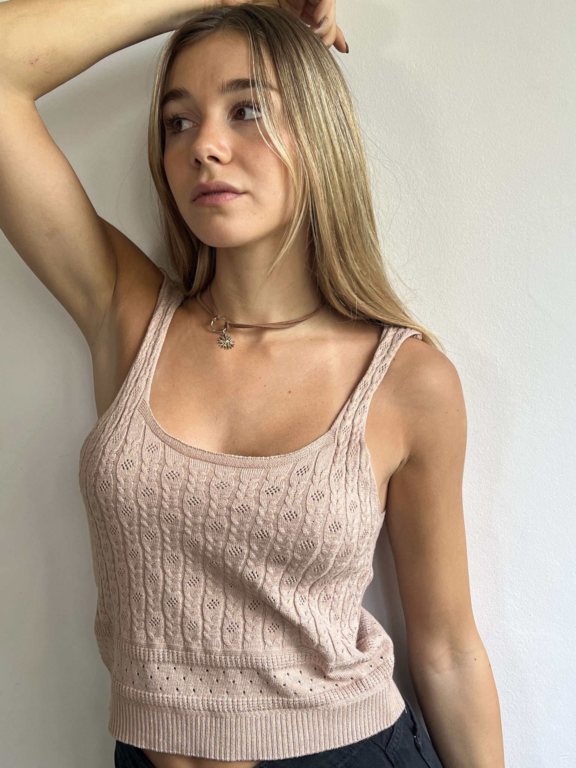 Musculosa tejida en hilo de lycra calada con detalles trenzados. Talle único.